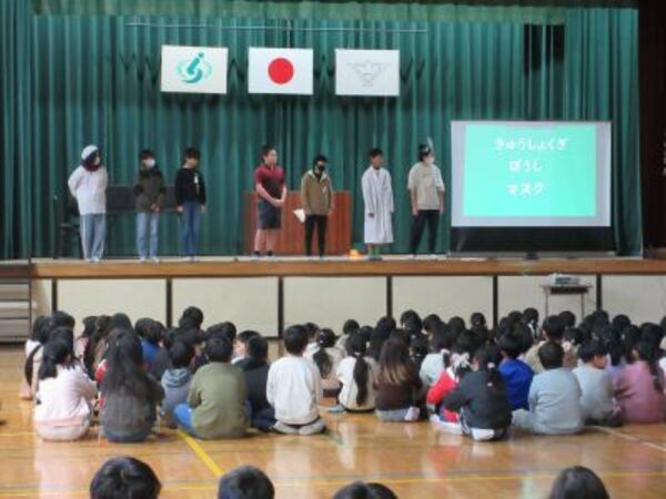今週は給食週間となっており、委員会の子どもたちが給食の素晴らしさや栄養バランスのよい食事をとること、マナーを守って食事をすることなど、劇にして発表してくれました。