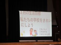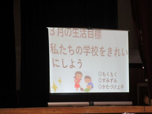 3月の生活目標は「私たちの学校をきれいにしよう~もくもく・すみずみ・かたづけ上手~」です。今回は美化委員会の子どもたちが、掃除や片付けをする劇をやってくれました。
