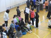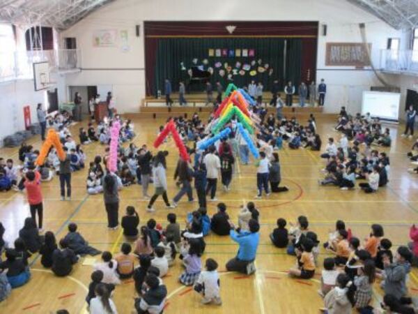 本校の6年生を送る会は、たてわりグループで集まって行います。まずは、たてわりグループで代表委員会が企画した遊びをしました。1年生から5年生までは6年生と遊ぶ最後のたてわり活動です。「かしら文字ゲーム」という「いつ・どこで・だれが・なにをしたゲーム」をアレンジした内容です。学年分け隔てなく楽しそうに活動していました。ゲームが終わり、各グループで6年生へのメダルの授与。6年生がとても誇らしく見えました。