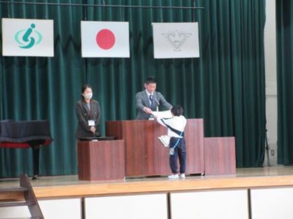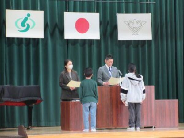 書初め展覧会や図画工作の作品展など、多くの子どもが表彰を受け代表による授与をおこないました。